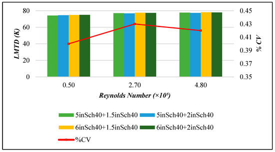 A sensitivity test on model dimensions was also done for different inner and outer diameters, as seen in Figure 3. As can be seen, the %CV for LMTD at three different Reynolds numbers is less than 5%, still indicative that the model can be utilized at different tube dimensions.