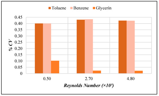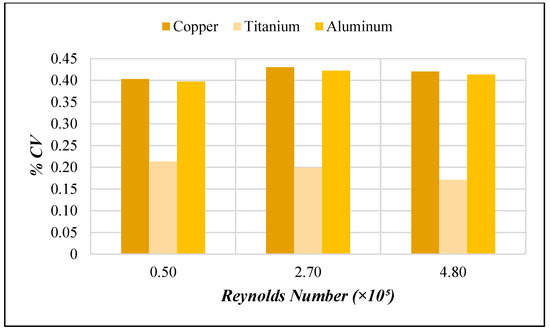 The fluid type and solid material were also varied to test the sensitivity of the baseline model to changing fluid and solid conditions. Here, the impact was tested at various Reynolds numbers and model dimensions. As can be seen in Figure 4 and Figure 5, the %CV for LMTD is less than 5%, indicating that the model used is independent of fluids and solids employed.