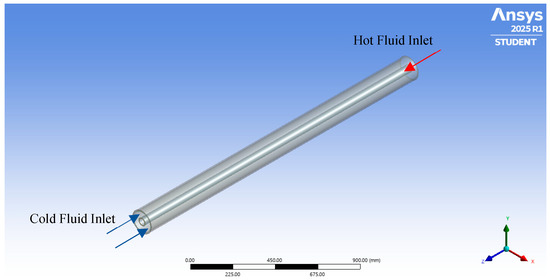 This study focused on a CCTHE configuration wherein the hot liquid toluene was passed through the inner pipe, and cold water flowed through the annular outer pipe side. The fluids assigned were assumed to have constant viscosities and densities throughout the heat transfer process. The inner and outer pipe materials were specified as copper and steel, respectively, and the fluid and material properties were defined by the ANSYS Fluent 2021 R2 material database, as shown in Table 3.