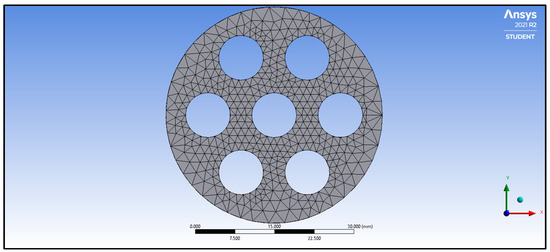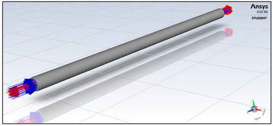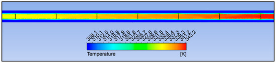The resulting computational domain for the system is presented in Figure 10. A realizable turbulence model with enhanced wall treatment was employed for the numerical calculation using the finite volume method [13]. The SIMPLE algorithm was utilized to solve the velocity–pressure coupling, and the second-order upwind scheme was selected to discretize the continuity, momentum, energy, turbulence kinetic energy, and dissipation rate equations [23]. Moreover, the least square cell-based method was used for gradient calculation.