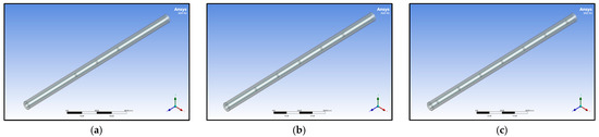 Isometric view of the arrangement of circular perforated inserts along the inner pipe length: (a) N = 3, (b) N = 5, and (c) N = 7.