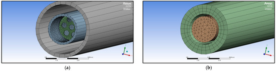 Generated CCTHE with inserts mesh grid: (a) solid domain and (b) fluid domain.