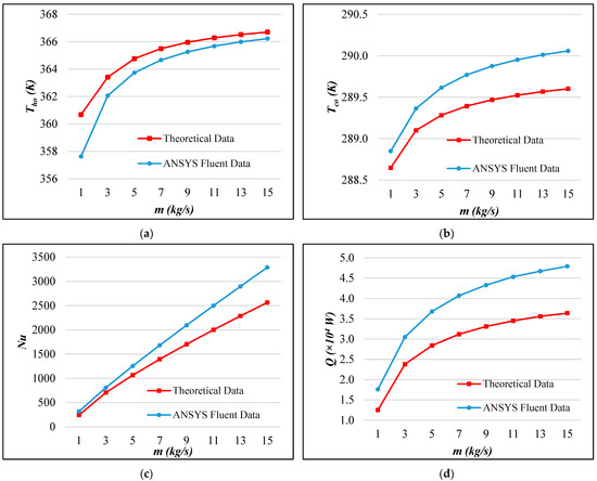 The flow regime at varied inlet flow rates satisfies all the conditions of the Dittus–Boelter correlation. The theoretical data calculated and the ANSYS Fluent 2021 R2 data for Th,o, Tc,o, Nu, and are illustrated in Figure 11.
