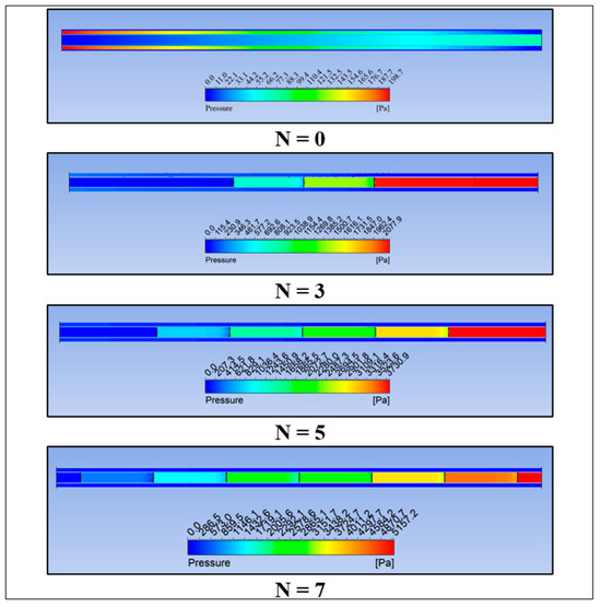 The velocity, temperature, and pressure profiles at various perforated insert quantities (N) are presented in Figure 12, Figure 13, and Figure 14 respectively. It can be observed that as N is increased along the inner tube length, the flow disruption becomes remarkable in the hot fluid region.