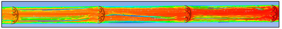A maximum α of 2.02, as can be seen in Figure 21, indicated that the AHT method was effective considering both the convective heat transfer and the friction loss. Moreover, a remarkable increase in heat transfer rate by up to 4.28 times can be depicted in Figure 22. This enhancement is attributed to the formation of turbulence and recirculation as the pipe rotates [26]. Figure 23 presents the build-up of swirls and vortices across the pipe length that induces rapid thermal mixing. On the other hand, Figure 24 shows the temperature profile of the hot fluid domain at the inner pipe inlet and inner pipe outlet. Consequently, heat transfer enhancement occurred more efficiently. These comparable results denote that the active AHT method applied is promising in terms of parameters such as low friction loss and high convective heat transfer and heat transfer rate.