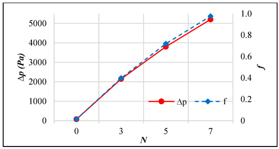Pressure drop () and friction factor (f) at varied insert quantity (N).