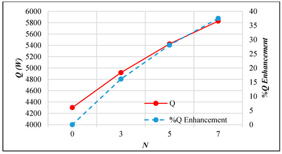 Nu rapidly increased with the increase in pipe inserts, as can be observed in Figure 18, indicating the dominance of active convection during the heat exchange. However, the decreasing trend of α was notable. This implied that the pressure drop was high compared to the heat transfer rate enhancement [25]. On the other hand, Figure 19 shows that the heat transfer rate () is enhanced with the increasing value of N. The maximum result is comparable with the heat transfer enhancement obtained by previous studies, as presented in Table 8.