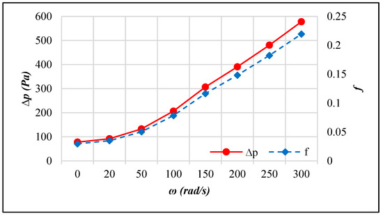 Pressure drop () and friction factor (f) at varied rotational speed (ω).
