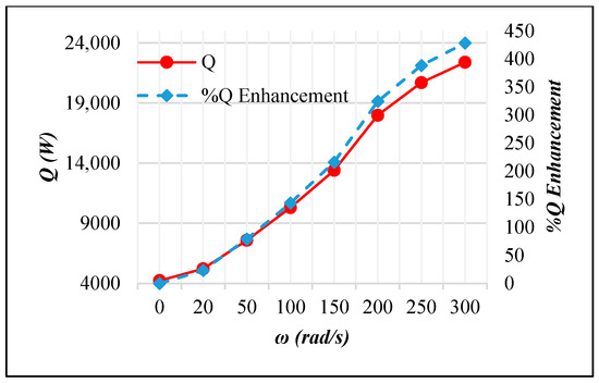 The active AHT study was performed by incorporating a rotating inner pipe in the system. The rotational speed () was set as the main parameter in ANSYS Fluent 2021 R2 and is varied at = 20, 50, 100, 150, 200, 250, and 300 rad/s. , , f, and Nu were obtained from the simulation and was evaluated.