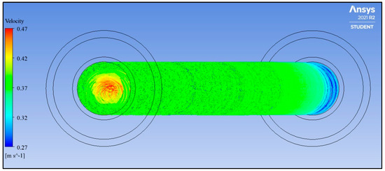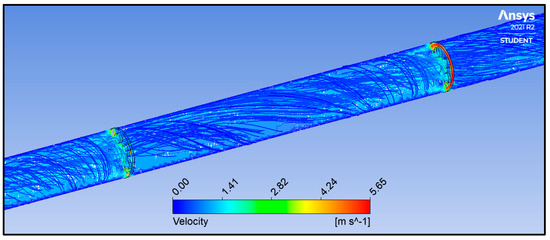 Figure 15 shows that a smooth flow without any disruption forms an inactive thermal layer at the boundary of the inner pipe and hot fluid domain, while Figure 16 shows the formation of swirls when inserts are positioned along the inner pipe. This flow disturbance stipulated better mixing of the inefficient boundary layer and the core fluid, providing a better temperature distribution as depicted in Figure 13.