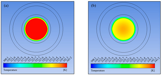 Hot fluid domain temperature profile (ω = 20 rad/s): (a) inner pipe inlet and (b) inner pipe outlet.