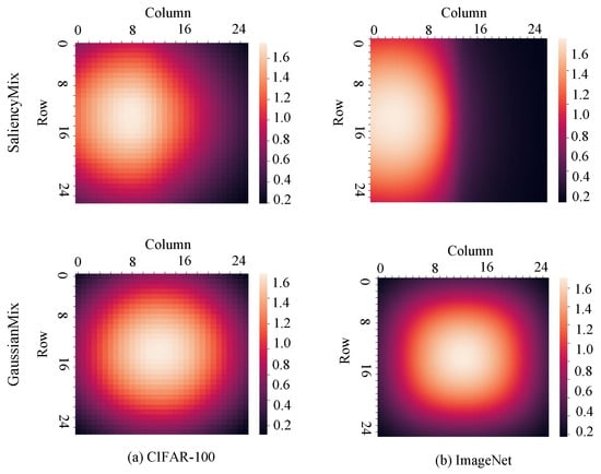 The receptive field of a CNN represents the influence of all image pixels on the network’s output, and is a fundamental concept in convolutional architectures [20,32]. However, not all pixels contribute equally; rather, their impacts vary based on location due to the nature of the convolution operation [20]. Central pixels have multiple pathways by which to propagate information, whereas edge pixels have fewer, leading to center pixels having greater importance for both forward and backward passes. Luo et al. [20] suggested that this influence follows a Gaussian distribution, where central pixels play a more significant role than those at the periphery. Building on this insight, we propose GaussianMix, an effective data augmentation method that selects the source patch using a center-biased Gaussian distribution, thereby leveraging receptive field properties to enhance model performance.