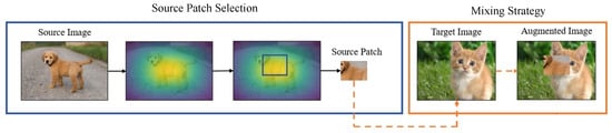Due to their large model sizes, a significant amount of data is required to train deep learning models. However, collecting labeled data is a time-consuming and tedious job. To address this problem, various Data Augmentation (DA) methods have been proposed; these apply different transformations on existing data to create new samples with high variation. Traditional DA methods [21,22,24,25] increase the number of samples or their variations by applying simple image transformations, introducing color distortions, injecting noise, Gaussian smoothing, etc. However, traditional DA methods fail to enhance the model’s robustness against occlusion. Several recent studies have suggested mixing different image patches to enhance the generalization ability of CNNs [12,13,14,15,16]. For example, Cutout erases random image regions [12]; however, this can hurt the model’s performance, as the missing pixels alter the training data distribution [13]. Instead, Mixup [26] proposes mixing two training samples and their labels to generate an augmented image. However, the augmented images are locally ambiguous. Considering the limitations of Cutout [12] and Mixup [26], CutMix [13] proposes cutting a patch from a sample and mixing it with another training image. Due to the success of CutMix [13], Mixed Sample-based Data Augmentation (MSDA) techniques have drawn much attention. Because MSDA combines multiple images to generate new samples, it occludes various parts of the object, preventing the network from focusing only on the specific parts that are most discriminative; in other words, it guides the model to consider the less discriminative parts in order to enhance the model’s generalization ability. In MSDA, the augmented image along with the mixed labels confers a label smoothing effect on the network that prevents the model from being overconfident [27]. MSDA techniques can be classified into two categories, namely, random patch-based and salient patch-based.