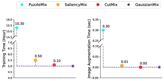 Figure 3 shows a comparison of augmentation and training times across different methods. For single images, GaussianMix demonstrates a comparable augmentation time to CutMix [13], while achieving substantial reductions of 45.54% and 80.39% in comparison to SaliencyMix [15] and PuzzleMix [14], respectively. Likewise, GaussianMix requires a training duration similar to CutMix [13] in terms of overall training time complexity, while significantly reducing training time by 97.5% and 99.93% compared to SaliencyMix [15] and PuzzleMix [14], respectively.