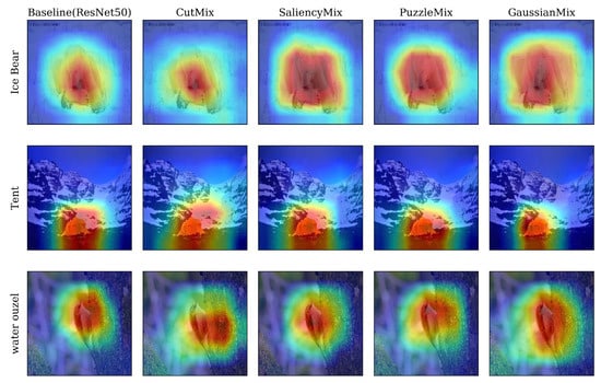 Deep learning models are highly vulnerable to adversarial attacks [35], where small and even imperceptible perturbations can result in misleading predictions [36,37]. Expanding the training dataset through data augmentation improves model robustness by generating diverse samples beyond the original dataset [38]. To assess this improvement, we evaluated various data augmentation techniques using a white-box adversarial attack, namely, the Fast Gradient Sign Method (FGSM) [37], on the ImageNet validation set. To evaluate the robustness of different augmentation methods, we employed a pretrained ResNet-101 [1]. As shown in Table 4, the results indicate that GaussianMix enhances robustness more effectively than SaliencyMix [15] or CutMix [13]. Unlike SaliencyMix, which extracts deterministic patches, GaussianMix incorporates probability-based diverse image regions, leading to broader variation in augmented samples. This results in a performance gain of 1.36% over SaliencyMix and 0.02% over CutMix, demonstrating the superior adversarial robustness of our proposed approach.