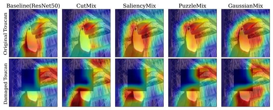 Class Activation Map (CAM) visualizations of original and occluded Toucan image from ImageNet for various data augmentation methods. The occluded image simulates real-world scenarios where targets may be occluded. The top row displays the CAMs for the original Toucan images, while the bottom row shows the CAMs for the occluded Toucan images with the salient part removed. GaussianMix enables the deep learning model to effectively capture the remaining parts of the target.