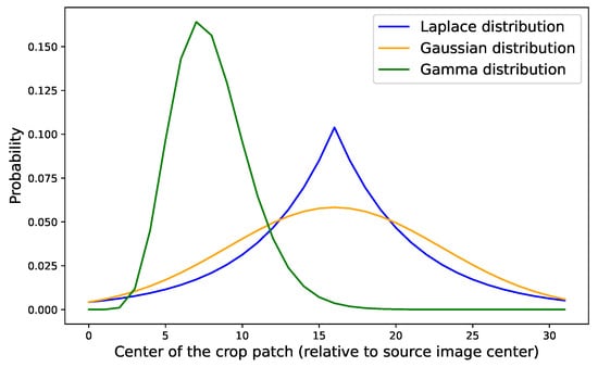 To assess the impact of different distributions in selecting source patches, we considered three distributions with distinct characteristics: (i) the Gaussian distribution, which has kurtosis similar to a normal distribution and exhibits center bias; (ii) the Gamma distribution, which is less center-biased; and (iii) the Laplace distribution, which has higher kurtosis than a normal distribution. The distribution curves are visualized in Figure 7. We conducted experiments using ResNet-18 [1] as the baseline model on the CIFAR-100 dataset [21]. As shown in Table 7, the Gamma distribution tends to select patches at the image boundaries. This may result in the model focusing on specific parts of the image, and can consequently impair its performance. In contrast, the Laplace distribution predominantly selects the image center. This permits the model to learn from various image regions, allowing it to outperform the Gamma distribution. However, the Laplace distribution may not provide as much variation in the selected patches as the Gaussian distribution, which offers patch diversity while also emphasizing salient regions of the image.