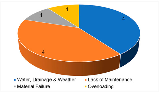 The results indicate that the most significant contributors to asset deterioration are insufficient and irregular maintenance throughout the asset’s lifecycle and damage caused by water ingress and weathering, both of which frequently lead to structural failure.