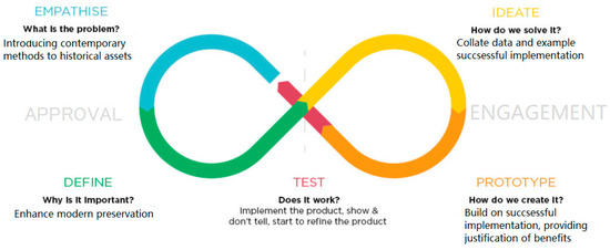 A theoretical framework has been developed, as shown in Figure 6, to establish a structured strategy for repairing and maintaining historical assets. The framework consists of five iterative stages—Empathise, Define, Ideate, Prototype, and Test—which together form a continuous improvement cycle. It is designed to facilitate managed change, balancing preserving historically significant features with the practical requirements of continued use.