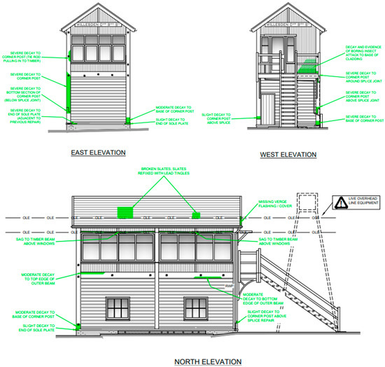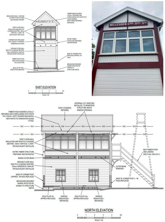 By applying the framework, a material change could be implemented without full local LPA approval. A review of the product acceptance standard confirmed that building materials were outside the scope of this document. Following this review, a reassessment of the 2014 design was initiated, incorporating wood-grain-effect PVC cladding as an alternative to traditional timber. As a commercial off-the-shelf product, the PVC cladding met all necessary British Standards certification and, through an inquiry with the original equipment manufacturer (OEM), could be customised to match the original RAL colour scheme of the signal box. The use of substitute materials such as PVC in heritage contexts is increasingly supported in international conservation practice [41,42,43]. This aligns not only with the findings of the Railway Heritage Trust [24] but also with international preservation guidance, such as that issued by the U.S. National Park Service (2023) [44], which supports the use of substitute materials in historic buildings when appropriately matched. The revised designs for replacing the previous wooden cladding with PVC cladding like-for-like and implementing the new material on site are illustrated in Figure 9.