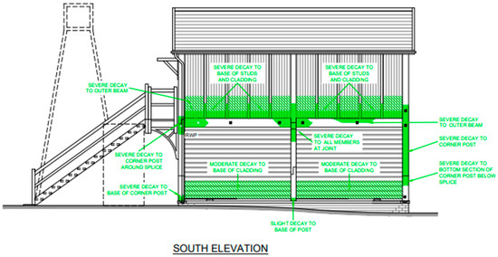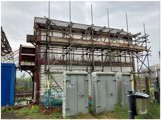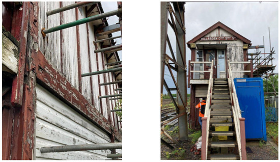 A signal box awaiting refurbishment was identified, with an existing repair design dating back to 2014. The structure exhibited extensive rot in its primary timber structural members and side panelling, as documented in Figure 7 and Figure 8. The observed deterioration is consistent with the research findings on common asset failure mechanisms, particularly the impact of insufficient maintenance and material degradation over time.