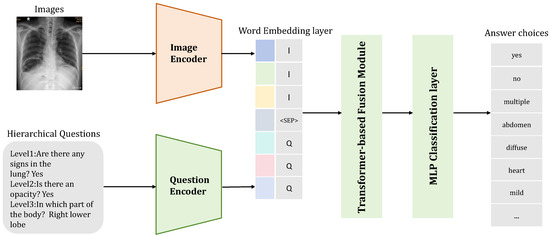 A schematic diagram of a hierarchical medical visual question answering framework. Medical images and fine-grained hierarchical medical questions are fed into an image encoder and a text encoder. The encoded features are then input into a Transformer-based fusion module for multi-modal feature integration, and finally, an MLP classification layer is employed to predict the answer candidates for the corresponding medical question.