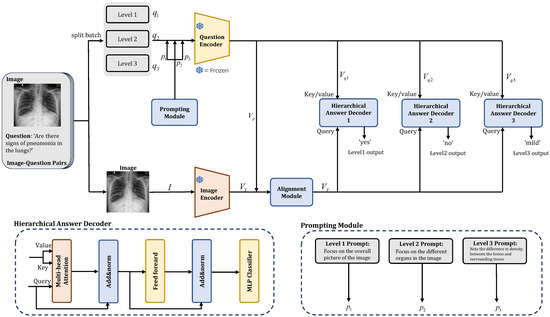 To achieve this goal, we first encode the image from an image–question pair using an image encoder to obtain . The hierarchical prompts corresponding to the medical questions of each image are then encoded by a text encoder. These prompts—, , or , depending on the question’s hierarchical level—generate prompt embeddings . The image encoding and prompt encoding are fed into an attention-based alignment module for preliminary fusion, producing image-prompt features to strengthen the visual reference space. The medical question from the sample is input into the same text encoder to obtain question features . Finally, the question features and image-prompt features are processed by hierarchical cross-attention answer decoders for multi-modal fusion and final answer prediction. The subsequent sections provide detailed descriptions of each module.