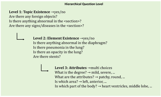 Hierarchical questions overview: The questions are organized into three levels, representing a stepwise refinement of inquiries regarding the patient’s medical imaging condition. The first two levels employ binary “Yes” or “No” response candidates, while the final level contains multiple-choice candidates primarily describing pathological attributes.
