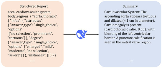 The questions in structured medical VQA are typically hierarchical, such as those in the Rad-restruct dataset, as shown in Figure 3. In structured medical visual question answering, questions are often hierarchical. The question hierarchy, as illustrated in the figure, consists of three levels. The highest level asks about general findings, such as the presence of signs, diseases, abnormal regions, or objects. The second level focuses on specific elements, such as a particular object or disease. The lowest level asks about specific attributes. Current models often struggle to differentiate the fine-grained visual details required by the questions due to the lack of clear hierarchical reasoning guidance. Our approach addresses this by using a hierarchical prompt module to guide the model’s attention to different fine-grained image regions. One point that needs clarification is that in the Rad-Restruct dataset we used, each patient sample corresponds to a medical image, and each image is linked to a pre-filled structured report template. In the hierarchical prompt module, we employ the Deepseek API (https://platform.deepseek.com/api_keys, accessed on 8 January 2025) to input different prompt words for each level, summarizing these structured report templates. The diagram illustrates this process.