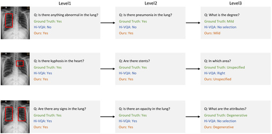 We conducted ablation experiments to evaluate the impact of hierarchical answer decoders and cross-attention fusion modules on the predictive ability of our HiCA-VQA model. Table 4 evaluates the impact of the hierarchical answer decoders and cross-attention fusion module on the performance of each method model, using accuracy, F1 value, precision, and recall. First, we introduce our hierarchical answer decoders into the Hi-VQA framework. Similarly, we remove the hierarchical answer decoders in our architecture. The results show that the performance is reduced due to the lack of hierarchical answer decoders, indicating the effectiveness of our hierarchical prompt module and showing a performance improvement compared with the baseline model. We further examine the importance of the cross-attention fusion module. Both Hi-VQA and context-VQA use a single-layer transformer fusion module with a self-attention mechanism. We first introduce our cross-attention fusion module into the Hi-VQA. We also use the image as the query and the text features as the key–value pair to input the fusion module without alignment. The effectiveness of the cross-attention fusion module can be seen from the performance improvement of the results. Similarly, we replace our fusion module with a single-layer transformer fusion module. Experiments demonstrate that simple feature concatenation fails to model cross-modal relationships effectively, whereas our attention mechanism enables superior hierarchical fusion. Ablation studies confirm the advantages in visual QA tasks.