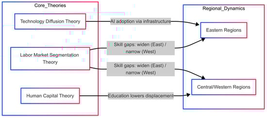 Key hypotheses and the relationships between them make up the study’s theoretical framework as shown in Figure 1, which is as follows: While Technology Diffusion and Labor Market Segmentation theories are well-established, their intersection in China’s context reveals unique mechanisms—regions with advanced infrastructure (e.g., eastern provinces) experience AI-driven skill polarization, whereas underdeveloped regions (central/western China) leverage AI for industrial upgrading, moderated by policy interventions. This tripartite interaction offers a novel lens for analyzing developing economies.