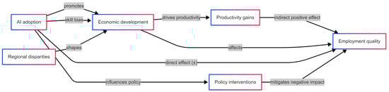 Economic development is fueled by the adoption of AI, which drives innovation and efficiency. In consequence, economic development shapes regional disparities; stronger infrastructure in affluent areas leads to greater benefits, which in turn leads to uneven employment results. In addition, growth and better work prospects are two ways in which AI-driven productivity increases indirectly improve employment quality.