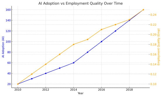 Nevertheless, this study deviates from a large portion of the literature by concluding that AI has a negligible practical impact on the quality of employment [41,42]. This study presents a fair view that helps to explain the small effect size of structural and geographical traits exclusive to China, even if the general conversation usually predicts disruptive changes in labor markets [41,42,43,44]. This disparity highlights the need for context in assessing the larger effects of artificial intelligence. The results on AI’s overall effect on job quality, including its statistically significant but limited practical implications, were found to be average in contrast with more disruptive estimations in the literature. This well-rounded perspective lends credence to the idea that politics and geography greatly influence the implications of AI, which are not always revolutionary.