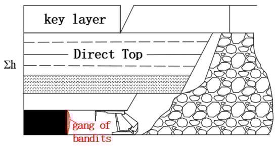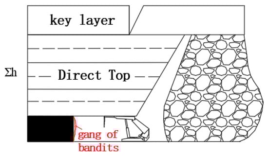 (2) The second type of immediate roof is shown in Figure 2, which is characterized by the occurrence of one or two layers of thick strata with great strength and undeveloped fissures in the immediate roof. When the mining height is ordinary, the strata are equivalent to the “basic roof”, and when the mining height is large, the immediate roof is made.