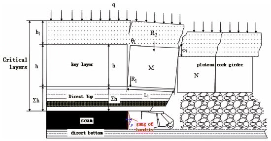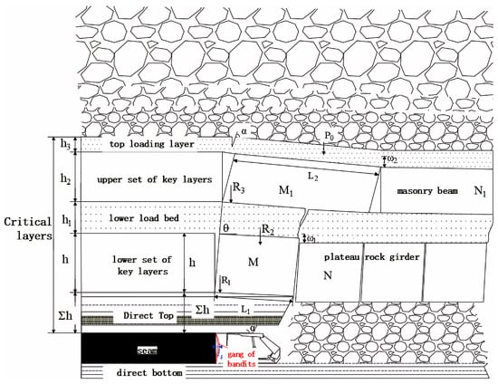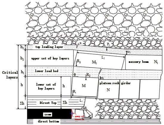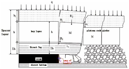 For the shallow buried close-distance coal seam with double key strata between layers, the key strata of the lower roof of the working face first bear large stress and then break when the stress exceeds their bearing capacity. Due to the redistribution of stress, the broken rock stratum forms a similar step-like rock beam structure []. This structure can temporarily support the weight of the overlying strata to a certain extent, but due to its instability, the working face has small periodic weighting. With the development of mining, the stress is gradually transferred to the upper group of key strata. When the stress accumulates to a certain extent, due to the stress concentration and the interaction between the rock strata, the upper and lower groups of key strata are broken synchronously. After the key strata of the upper group are broken, due to the massive structure and mutual occlusion of the rock strata, a structure similar to a “masonry beam” is formed []. This structure can provide better bearing capacity to a certain extent, but its stability is still limited by the mechanical properties and mining conditions of the rock strata, and the working face has large periodic weighting. The support resistance of the working face of this kind of coal seam should be based on the control of large periodic pressure, and the roof structure model of the working face of the double key layer in the shallow buried coal seam is established, as shown in Figure 9.
