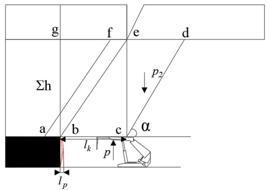 The external forces that generate the rotational movement of the direct roof hard layer are the self-weight of the direct roof hard layer , the load of the upper direct roof borne by the overhanging roof part , and the additional force of the basic roof []; what prevents it from rotating is the resistance given by the lower direct roof to the direct roof hard layer . When the direct roof hard layer is rotating, the upper surface of the direct roof hard layer will be delaminated toward the coal wall at point A. At the same time, near the fracture line, it receives additional force from the upper direct roof and the unbroken direct roof hard layer in front of it, and the rotation of the direct roof hard layer will lead to the deformation and sinking of the lower direct roof. Therefore, the bracket resistance should stop the damage caused by the large rotation of the fracture line when it just enters the upper part of the coal wall, and, at the same time, it should prevent the direct roof hard layer from sliding down at the fracture line and causing the step down of the working face. When is not taken into account, there are