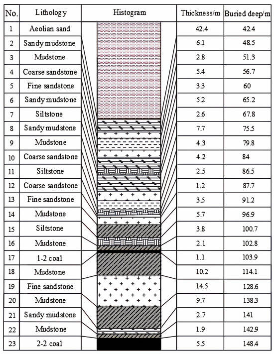 For the supplementary Bulianta 32206 face mine, regarding the 2–2 coal seam, by arranging drill holes in the working face and the surrounding areas of the coal mine, detailed information regarding the coal and rock seams is obtained, and a comprehensive bar chart of the working face is drawn. With an average mining height of 5.5 , a dip angle of , and a burial depth of 145~155 , the upper 1–2 upper coal has been mined with an average mining height of 1.1 , an average spacing of 39 between seams, and an inter-mining ratio of . There is only one key stratum above the coal seam. The thickness of the key stratum is 14.5 m. The direct roof is below the key stratum, and the thickness of the direct roof is 14.3 m. The direct roof is composed of rock strata with the same lithology or different lithology but less mechanical difference, which conforms to the first type of immediate roof structure of a single key layer. The comprehensive histogram of the working face is shown in Figure 5.