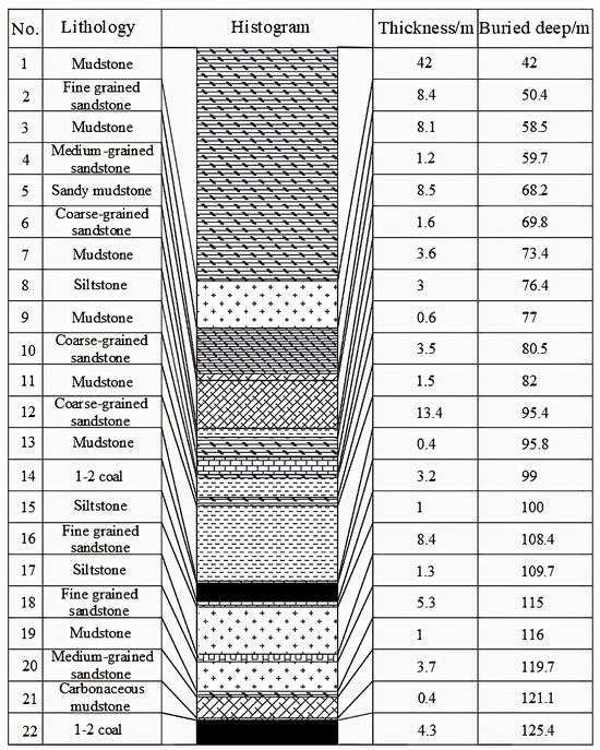 For the supplementary Bulianta 22303 face mines, regarding the 1–2 coal seam, by arranging drill holes in the working face and the surrounding areas of the coal mine, detailed information regarding the coal and rock seams is obtained, and a comprehensive bar chart of the working face is drawn. It has an average mining height of , a dip angle of , a burial depth of , an average spacing of 47 m between the seams, and an inter-seam mining ratio of (according to the empirical formula to calculate the condition of double key seams of ). There are two key layers above the coal seam, which conforms to the coal seam mining conditions of the double key layers between the layers. Under the first key layer, there is a direct roof. There is a thick rock layer with high strength and undeveloped fissures in the direct roof, which conforms to the second type of direct roof structure of the double key layer. The comprehensive histogram of the working face is shown in Figure 12.