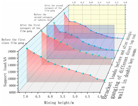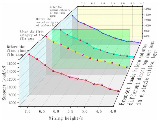 The support loads consist mainly of the direct top weight and the structural loads of the “step beams” at the lower critical level. The influence of the upper key layer is reflected by the transfer of loads to the lower key layer structure []. The upper key layer is farther away from the brace, and its weight and stability with the overlying rock layer affect the behavior of the whole roof system. Its loads are transferred to the brace through the structure of the lower key layer.