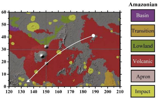 - Tanaka, K.; Robbins, S.; Fortezzo, C.; Skinner, J.; Hare, T. The digital global geologic map of Mars: Chronostratigraphic ages, topographic and crater morphologic characteristics, and updated resurfacing history. Planet. Space Sci. 2014, 95, 11–24. [Google Scholar] [CrossRef]