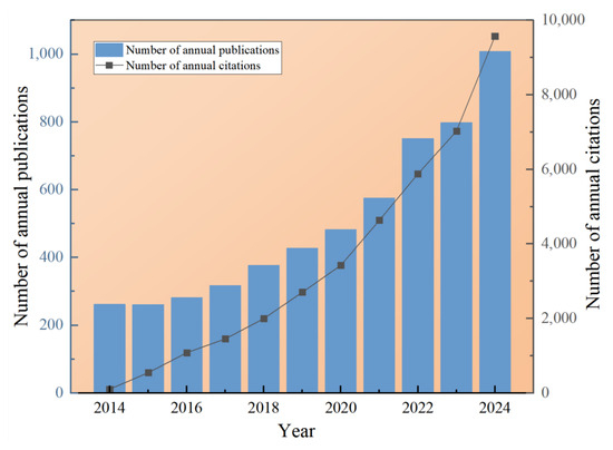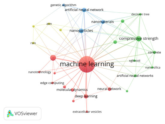 With the rise in artificial intelligence in recent years, it has become a common practice to use ML methods in engineering problems [28,29,30,31,32]. ML is a subfield of AI that has many applications beyond simple data analysis. The regression function in ML has been used in multiple instances, one of which is to predict the compressive strength of concrete. ML uses algorithms that learn from input data and produce highly accurate output data compared to more traditional regression techniques [33]. Artificial Neural Networks (ANNs) and Support Vector Machines (SVMs) are the most popular machine-learning techniques for predicting the compressive strength of concrete. Dantas et al. [34] used an artificial neural network to predict the compressive strength of construction and demolition waste (CDW) concrete. Chou et al. [35,36] explored several ML methods including ANNs and SVMs for predicting the compressive strength of concrete. Mustapha and Mohamed [37] applied a weighted SVM-based prediction method to a more complex problem to predict the unconfined compressive strength of high-performance concrete (HPC). Pham et al. [38] improved the least squares SVM with meta-heuristic optimization. Naderpour et al. [7] used ANN to predict the environmental strength of concrete. Ashrafian et al. [39] predicted the strength of fiber concretes and ultrasonic pulse velocity based on heuristic regression methods. The analysis of the Web Of Science data from 2014 to 2024 is shown in Figure 1, which shows a significant increase in ML publications related to nano-modified concrete, and further, as shown in Figure 2, it is seen that the most relevant topics for nano-modified concrete in the last 10 years are DT, eXtreme Gradient Boosting (XGB), and ANN; the ML, nanomaterials, and machine learning part of the model are shown by visualization, which shows that the diverse applications of ML in nano-modified concrete. To support this review, a structured literature search was conducted. Sources were mainly retrieved from Web of Science. We used general combinations of keywords such as (“nano”OR “nano concrete”) AND “machine learning”. The publication years were limited to 2014–2024. Only English peer-reviewed journal articles and relevant conference papers were considered. The search results were manually screened based on titles and abstracts to exclude duplicates and unrelated studies.