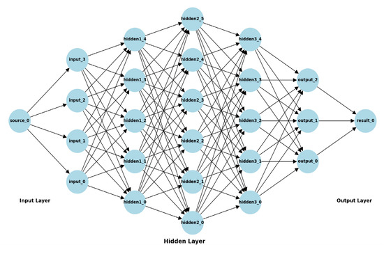 Artificial Neural Networks (ANNs) are well-suited for handling large and complex machine learning tasks. An ANN consists of interconnected layers of edges and nodes, known as neurons, with weighted values. Multiple hidden layers can be inserted between the input and output layers. In this review, ANN models, as shown in Figure 5, use three hidden layers. ANN’s capabilities extend to deep learning, enabling the construction of multi-layered perceptrons that simulate the information transmission mechanism of biological neurons. Through training on input data, ANN learns the relationship between inputs and outputs. If the network’s predictions are inaccurate, the system adjusts the weights, gradually improving its ability to recognize patterns after sufficient training [40,41].