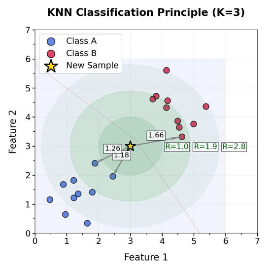The K-nearest neighbor (Figure 6) is a basic classification and regression method. It is one of the simplest algorithms in data mining technology, and its core function is to solve the supervised classification problem. The selection of the k value is also very important, in the application, if the k value is selected too large, it can easily cause underfitting, while too small can easily cause overfitting. Cross-validation results further reveal the prediction characteristics of the KNN model on the nano-concrete dataset (Data volume = 1030). When k = 3, the model shows sensitivity to outliers, particularly at a nano-SiO2 dosage of 0.5%, resulting in a relatively high MAE of 3.2 MPa. Conversely, using k = 10 leads to over-smoothing, which increases prediction deviation in the high dosage range (1–2%), with an MAE of 4.5 MPa. The best performance is achieved at k = 5, where the model reaches an optimal MAE of 2.8 MPa [42]. We generally select a smaller value, usually using cross-validation to select the optimal k value. The advantages of the algorithm are as follows: 1. simple, good implementation, no need to estimate the parameters, no need to train; 2. suitable for multi-classification problems (objects with multiple class labels), KNN performs better than SVMs in these cases. In small-scale nanomaterial datasets (e.g., n < 500), KNN demonstrates strong performance but is sensitive to feature scaling. It is recommended to apply Min–Max normalization to parameters with significant differences in magnitudes, such as nanoparticle size (nm) and specific surface area (m2/g). However, the KNN algorithm has the following drawbacks: (1) When the samples are unbalanced, such as a large sample capacity of one class and a small sample capacity of other classes, it is possible to lead to a majority of samples of large-capacity classes among the K neighbors of the sample when a new sample is input. (2) A large amount of computational effort, and for each sample to be classified, the distance from it to the full set of known samples has to be computed in order to find its K nearest neighbors [43,44]. Although the current application of KNN in nano-modified concrete is limited, its performance on small datasets and multi-label tasks shows potential. As more nanomaterial datasets become available, KNN may gain broader application in this field. Therefore, it is included here for completeness and future research reference.
