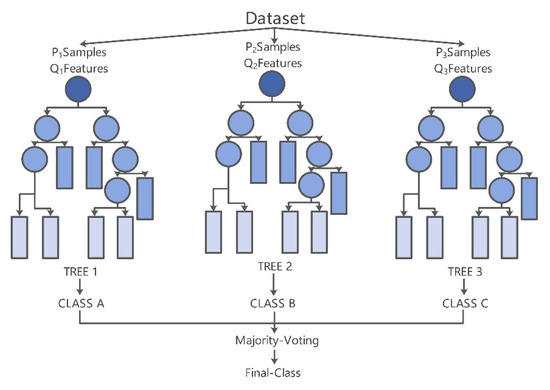 Before introducing Random Forest (RF), we need to introduce the concept of Bagging, also known as bootstrap aggregating, which is an integrated technique for training classifiers on the original dataset by re-selecting k new datasets through put-back sampling. RF is a kind of Bagging algorithm, RF has its own rules and designs for some of the details of Bagging. RF (Figure 8) uses a classification regression tree as a weak learner, while the general classification regression tree will select all the features for modeling. Therefore, not only the features are random, but also the feature randomness is guaranteed. That is, better generalization ability and resistance to overfitting (low variance) can be achieved. However, the fit for the training set will be worse [22,45,46].