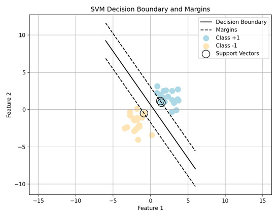 SVM is a supervised learning algorithm used for classification and regression analysis. It can perform linear or nonlinear classification as well as regression analysis. The basic principle of SVM (Figure 9) is to find an optimal hyperplane (which is a straight line in two-dimensional space) that separates the samples of different categories and maximizes the distance from the nearest sample point to the hyperplane. Due to its excellent generalization ability, SVM usually performs well on small sample datasets, but for large-scale datasets, the training time is long, so to use SVM, an appropriate kernel function is preferred [47,48,49].