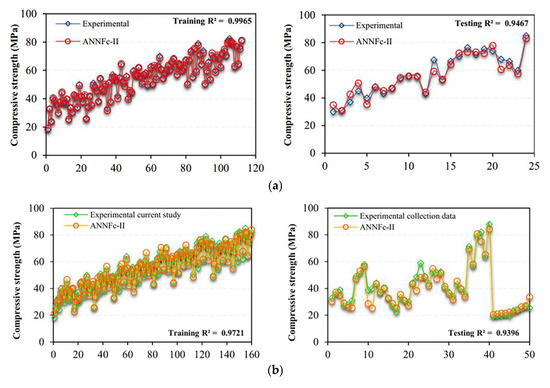 (a) Evaluation of experimental and predicted results by ANN-II model: compressive strength [25]. (b) Validation of ANN-II model using collected dataset: compressive strength [25].