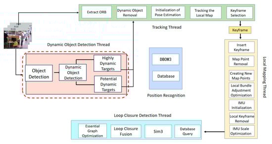 In this study, the proposed algorithm extends the ORB-SLAM3 framework by incorporating a dynamic object detection thread based on YOLOv8 and integrating a dynamic feature point removal module into the front-end tracking thread. The architecture of the enhanced ORB-SLAM3 framework is illustrated in Figure 1.
