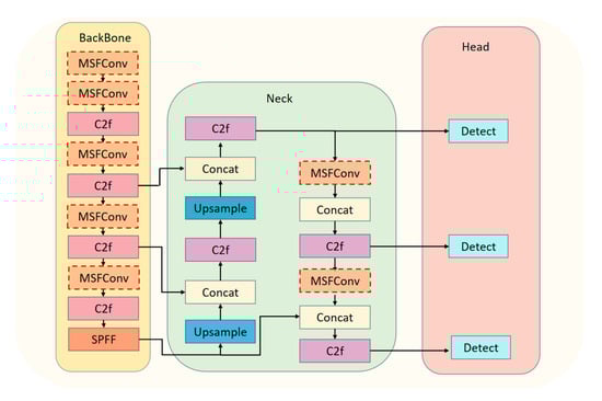 Despite its strengths, YOLOv8’s existing convolutional structure has a relatively limited capacity for feature extraction when handling dynamic or moving objects. This limitation can lead to reduced detection accuracy for dynamic targets, diminishing the algorithm’s effectiveness in scenarios involving mobile objects. To address this challenge and enhance YOLOv8’s performance in dynamic object detection, this study introduces a Multi-Scale Feature Extraction Convolution module (MSFConv). The MSFConv module replaces the original convolutional structure, improving target detection accuracy without significantly increasing the model’s parameter size. The architecture of the enhanced YOLOv8 network is shown in Figure 2.