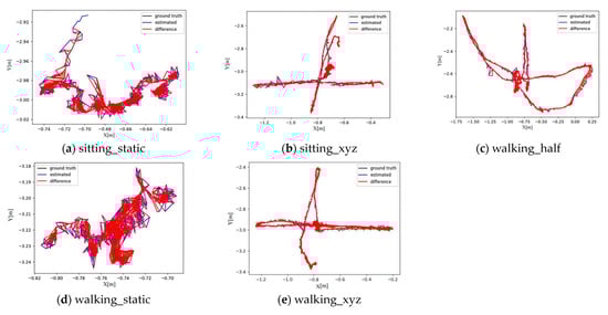 Figure 5 and Figure 6 compare the real and estimated trajectories between the improved algorithm and ORB_SLAM3. The black solid line represents the real trajectory, the blue solid line denotes the estimated trajectory, and the red shaded area highlights the error between the two trajectories. The smaller the shaded area, the higher the system’s walking_static, walking_half, and walking_xyz, the improved algorithm significantly outperforms ORB_SLAM3 with substantially smaller trajectory errors.