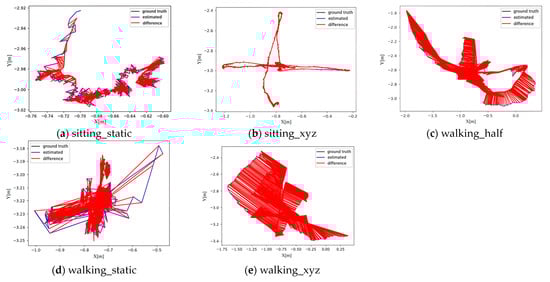 To evaluate the performance of the proposed algorithm, we utilized the TUM RGB-D dataset [], a widely recognized benchmark for visual SLAM systems, accessible at https://vision.in.tum.de/data/datasets/rgbd-dataset (accessed on 21 June 2024). This dataset provides synchronized RGB and depth image pairs captured using a Microsoft Kinect sensor at a resolution of 640 × 480 pixels and a frame rate of 30 Hz, alongside ground truth camera poses for accuracy assessment. The dataset includes a variety of indoor sequences designed to test SLAM algorithms under different conditions, such as static scenes, slow motions, and highly dynamic environments. In our experiments, we selected sequences from the “fr3” category, which are captured in a typical office environment and divided into two primary scene types: “sitting” and “walking”. The “sitting” sequences feature slow actions, such as gesturing and conversing at a desk with minimal object motion, while the “walking” sequences involve significant indoor movements, including people walking, which introduce dynamic elements challenging for SLAM systems.